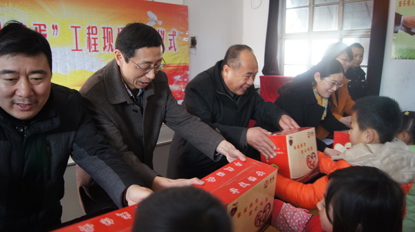 “愛心雞蛋工程”是由集團(tuán)董事長、總裁荀金慶于2010年發(fā)起的一項(xiàng)獻(xiàn)愛心工程,旨在踐行社會責(zé)任、關(guān)愛兒童成長,提倡讓孩子們每天能吃上一個雞蛋,使孩子們能夠健康成長。同時(shí),通過此項(xiàng)活動的開展,培養(yǎng)華威廣大員工關(guān)愛社會,關(guān)心他人,回報(bào)社會的無私奉獻(xiàn)精神?!皭坌碾u蛋工程”活動開展四年來,廣大華威員工積極響應(yīng)、踴躍參與,每個月都從自己不太多的工資中,拿出至少一元錢,奉獻(xiàn)自己的愛心,錢看起來不算多,但華威人就這樣日復(fù)一日,年復(fù)一年的堅(jiān)持不懈。四年來,全體員工共向愛心雞蛋工程捐款十萬余元,用來購買愛心雞蛋,先后向南辛、吳村、王莊、石門山、防山及息陬六個鎮(zhèn)的50所學(xué)校的2000多名小學(xué)一年級的孩子們送去了愛心雞蛋,并從中選出十名貧困家庭的兒童進(jìn)行長期資助。雞蛋雖然不多,但卻代表了華威全體員工的一片真誠的愛心。