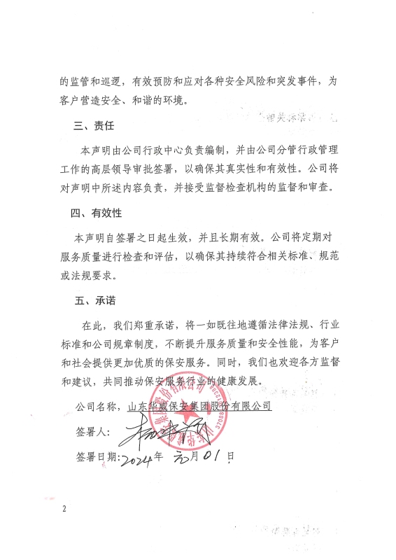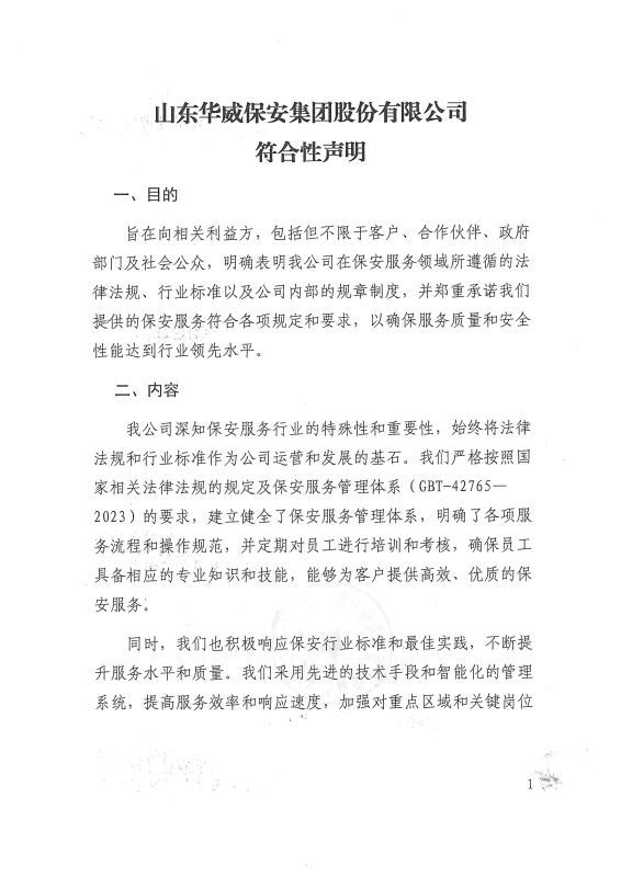 旨在向相關(guān)利益方,包括但不限于客戶、合作伙伴、政府部門及社會公眾,明確表明我公司在保安服務(wù)領(lǐng)域所遵循的法律法規(guī)、行業(yè)標(biāo)準以及公司內(nèi)部的規(guī)章制度,并鄭重承諾我們提供的保安服務(wù)符合各項規(guī)定和要求,以確保服務(wù)質(zhì)量和安全性能達到行業(yè)領(lǐng)先水平。