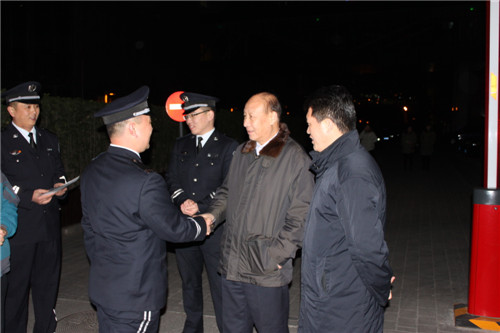 夜間,董事長在分公司領(lǐng)導(dǎo)的陪同下,對北京人濟(jì)置業(yè)發(fā)展有限公司、中石化總部等項(xiàng)目進(jìn)行了夜查,走訪慰問堅(jiān)守在一線執(zhí)勤的保安員工,送去了集團(tuán)領(lǐng)導(dǎo)的關(guān)愛之情。