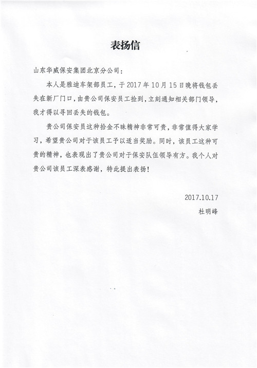 失主接到通知后前來領(lǐng)取,他對(duì)保安員表示感謝,立即拿出的100元現(xiàn)金作為酬謝,桑澤銳婉言謝絕說:“這是我們應(yīng)該做的,不是自己的東西不能拿”。兩天后,失主杜明峰又送來表揚(yáng)信,對(duì)桑澤銳這種拾金不昧的精神表示感謝。