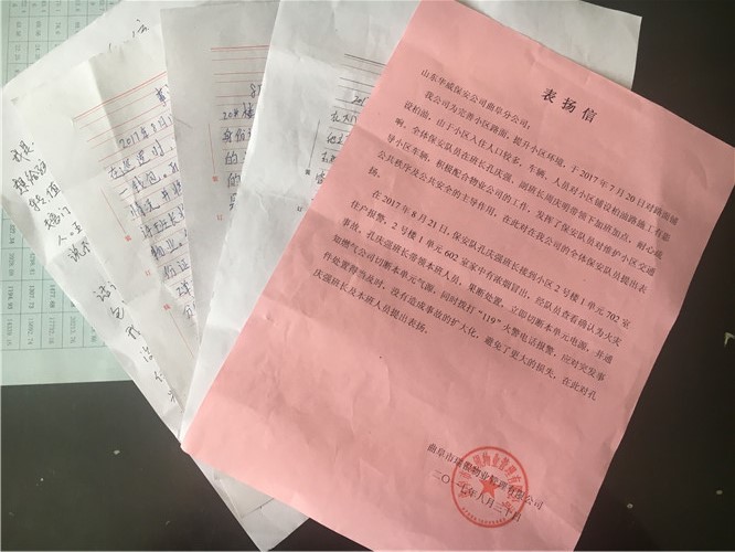 近期,曲阜分公司保安隊(duì)員在執(zhí)勤中做好人好事不斷,當(dāng)事人也分別送來多封表揚(yáng)信、感謝信: 2017年8月15日,駐裕隆實(shí)業(yè)保安班隊(duì)員孔祥東在巡邏時(shí)撿到錢包一個(gè),內(nèi)有...